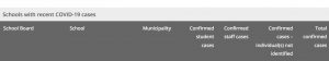 For the list of schools in Ontario with COVID-19 cases go to: https://www.ontario.ca/page/covid-19-cases-schools-and-child-care-centres#section-0
