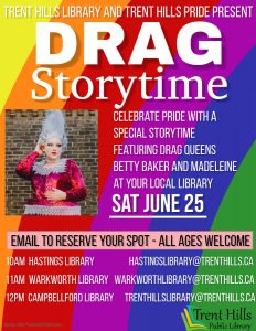 On Saturday morning June 25, starting at 10:00 am until 1:00 pm, Trent Hills Pride is proud to partner with the library for Drag Storytelling at all three libraries of Trent Hills hosted by Madeleine and Betty Baker. Hastings begins at 10:00 am, Warkworth Library at 11:00 am and Campbellford at noon. Email to reserve your spot: [email protected], [email protected], [email protected]