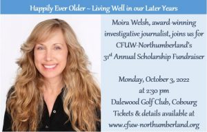 Moira Welsh, award-winning Toronto Star investigative reporter and author, will be guest speaker at CFUW-Northumberland’s 31st annual scholarship fundraiser on Monday, October 3.
