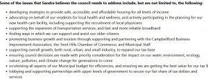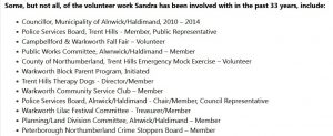 Sandra is familiar with the local partners, organizations, and agencies, and with resources that are available in Trent Hills and the County of Northumberland. She knows we are fortunate to have access to great County resources but states that it is vital that Trent Hills be strongly represented, both at Council and at the County level, to ensure that residents get their fair share and value for their tax dollars. Sandra wants to ensure County services/programs are accessible to Trent Hills residents.