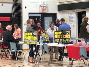 Candidates set up displays with information for people who attended