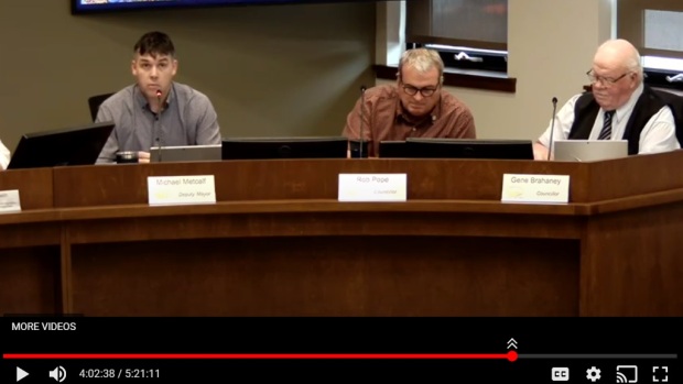 Screen shot Nov. 22 council meeting, from left, Deputy Mayor Mike Metcalf, Councillor Rob Pope, Councillor Gene Brahaney.