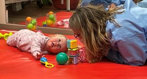 Occupational Therapist Nicole Vreeswyk’s coaxing is starting to pay dividends with one-year-old Nova Kruger. Slowly, but surely, Nicole urges Nova on and finally succeeds in getting the bright-eyed toddler to shake the rattle in unison to the beat. “Yaaaay!” Nicole says, beaming almost as brightly as the young girl in her charge.