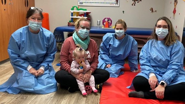 Centre of Attention: Mom Katie MacDonald (centre), shown holding her daughter Nova, is thankful that care provided by Five Counties Children’s Centre is close to home. Her family is benefitting from therapy services provided by Five Counties staff members (from left) Speech-Language Pathologist Kate Wentzel, Physiotherapist Stephanie Miske and Occupational Therapist Nicole Vreewyk. Image submitted