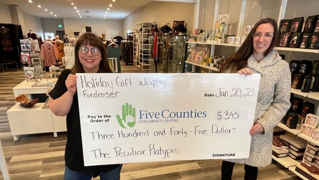 Pamela, who owns and operates the Peculiar Platypus in Campbellford, held a Charitable Gift Wrapping event on Dec. 23 and 24 in support of Five Counties. Despite a pre-Christmas winter blizzard that stranded many travellers, her Front Street North store was able to raise $345 for Five Counties.