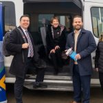 Cobourg – Feb. 15, 2023—To mark the upcoming six-month milestone for the Northumberland Commuter Connect transit service, County Warden Mandy Martin and Deputy Warden Brian Ostrander boarded the shuttle bus service in Colborne this morning to commute to today’s County Council meeting in Cobourg. MPP Piccini was on-hand to greet the commuters as they disembarked at the Northumberland Mall bus stop.