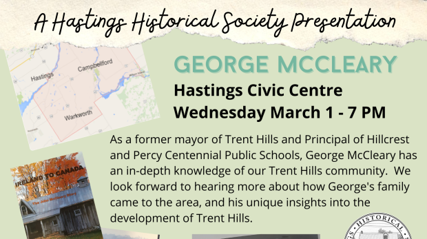 Hastings - Fri., Feb. 24, 2023 - Hastings Historical Society is very pleased that George McCleary will present his insights on a life spent in public service to this community as well as discoveries he has made from his thorough research of his ancestors and relatives who were the early pioneers of Percy and Alnwick townships.
