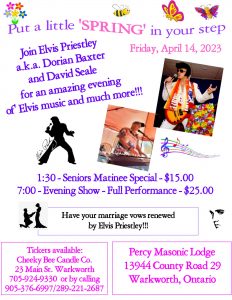 Elvis Returns! SPONSORED POST Show in Warkworth April 14 Tickets Available Now! SPONSORED POST 0 Sue D March 31, 2023 art, Warkworth #dorianbaxter#elvis#elvispriestley#masoniclodge