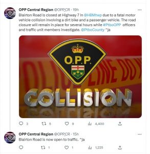 HAVELOCK-BELMONT-METHUEN TOWNSHIP - Mon., May 15, 2023 - Members of the Peterborough County Detachment of the Ontario Provincial Police (OPP) and emergency crews were called to the scene of a fatal collision on Blairton Road at approximately 6 p.m. on Sunday, May 14,2023.